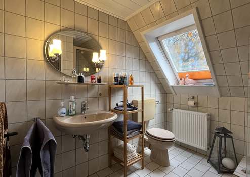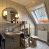 Das Dachgeschoss beherbergt ein Gäste-/Kinderzimmer, ein Badezimmer mit Dusche und das geräumige Hauptschlafzimmer. Die jetzigen Eigentümer haben bereits positive Gespräche mit dem Bauamt geführt, sodass das Dachgeschoss noch weiter ausgebaut werden dürfte.