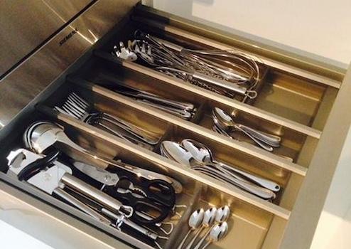 Die moderne, maßangefertigte Küchenzeile vom Möbelschreiner ist aus weißem,
