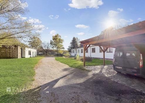 Zum Verkauf steht ein großzügig bebautes Grundstück mit einer Gesamtfläche von ca. 16.300 m². Das Anwesen verfügt über eine eigene Zufahrt; rund 6.000 m² sind als bebaubares Land ausgewiesen und eröffnen vielfältige Entwicklungsmöglichkeiten.