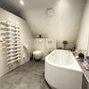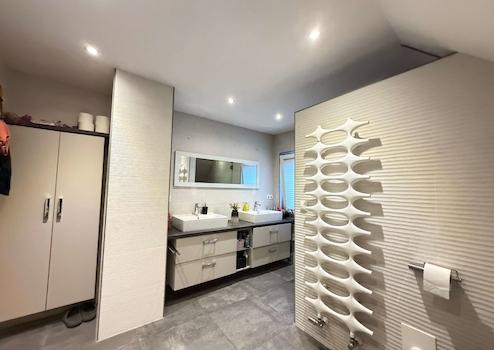 -- Das Designbad im Dachgeschoss ist mit einer eleganten Badewanne, zwei Waschtischen, einer ebenerdigen Dusche mit Glasabtrennung, Hänge-WC und hochwertigem Designer-Handtuchheizkörper ausgestattet – alles in zeitloser, moderner Optik.