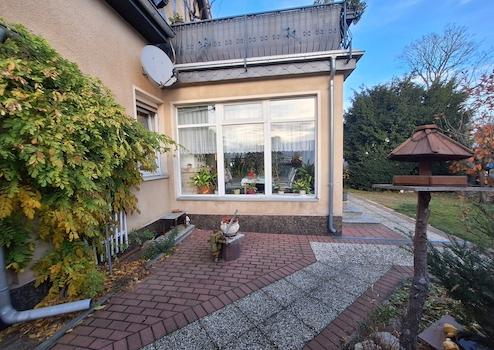 Die im Erdgeschoss gelegene 3-Raum-Wohnung erreichen Sie über einen gemeinsamen Hausflur von dem aus das kleine Duschbad und ein Wohnraum abgehen. Über einen kleinen Flur in der Wohnung erreichen Sie die gut geschnittene Wohnküche. Von hier aus können Sie Ihren Kindern beim Spielen auf dem Grundstück zuschauen. Das Wohnzimmer mit kleinem Erker schließt sich direkt an und bildet den Mittelpunkt der Wohnung. Der Wohnbereich wurde hier durch einen voll integrierten Wintergarten erweitert. Er kann ganzjährig genutzt werden. Die hohen Decken, die gute Belichtung, der Echtholzboden und der gesetzte Kachelofen sorgen für ein wohliges Raumgefühl. Das Schlafzimmer mit ca. 10 m² liegt ruhig am Ende der Wohnung und kann für eine andere Raumaufteilung auch mit dem dritten Wohnraum auf dieser Etage verbunden werden. Somit wäre eine Begehung des dritten Raumes direkt von der Wohnung aus möglich.
