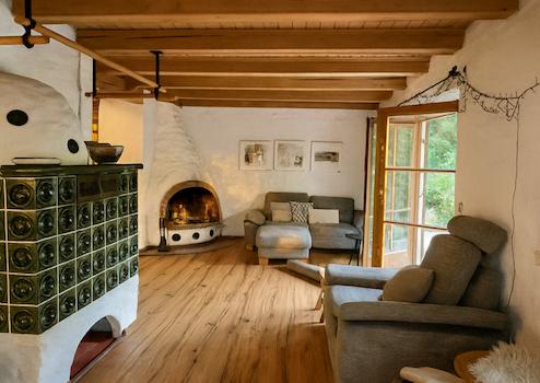 Ein zentrales Highlight ist der große offene Kamin im Wohnzimmer, der in den Wintermonaten für eine besonders behagliche Stimmung sorgt und den Raum in warmes, natürliches Licht taucht. Ergänzt wird er durch einen gemütlichen Kachelofen, der das gesamte Haus effizient beheizt und selbst das Obergeschoss angenehm warm hältein traditionelles Element, das den Charakter des Hauses perfekt unterstreicht.