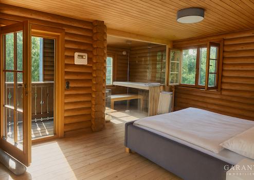Auch das Schlafzimmer überzeugt mit seinem harmonischen Materialmix aus massiven Blockbohlen und modernen Akzenten. Die integrierte Privatsauna macht den Raum zu einem exklusiven Rückzugsort und schafft ein luxuriöses Wellnessambiente.