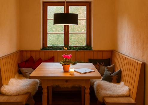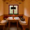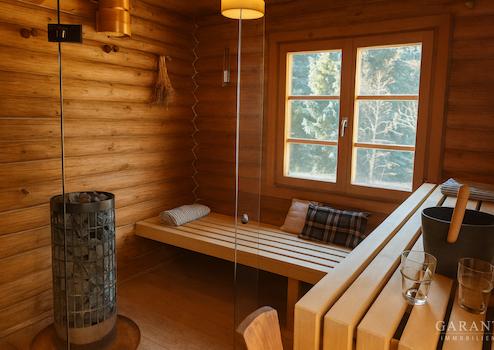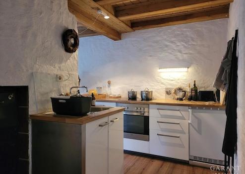 Schon beim Betreten entfaltet sich die besondere Ausstrahlung dieses Objekts: Warme Blockholzwände, sichtbare Balken und weiß gekalkte Naturputzwände schaffen eine harmonische, authentische Atmosphäre. Der offene Wohn- und Essbereich begeistert mit viel natürlichem Licht, gemütlicher Sitzecke und einem stilvollen Chalet-Flair.