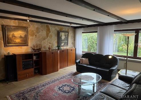 Im lichtdurchfluteten Wohnzimmer sorgt ein herrlicher, betriebsbereiter Kachelofen für behagliche Momente. Von hier führt der Weg in den Wintergarten mit offenem Kamin, der es ermöglicht, die Natur zu jeder Jahreszeit in vollen Zügen zu genießen.