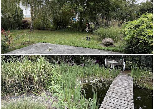 Der idyllische eingewachsene Garten lädt zum Entspannen und Genießen ein. Besonders die kleine Holzbrücke über den Teich verleiht ihm eine romantische Note ein, ein Ort der Ruhe und Urlaubsgefühle schenkt.