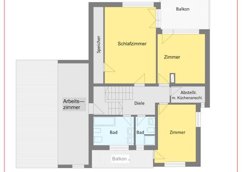 Zudem bietet das Obergeschoss die Möglichkeit einer Einliegerwohnung: Alle Anschlüsse für eine Küche sind vorhanden, sodass hier eigenständiges Wohnen möglich ist.