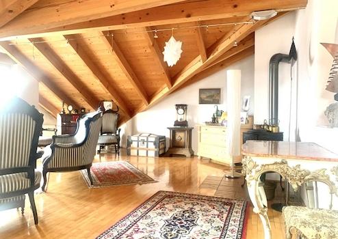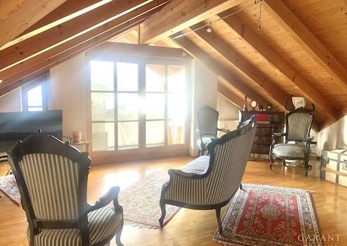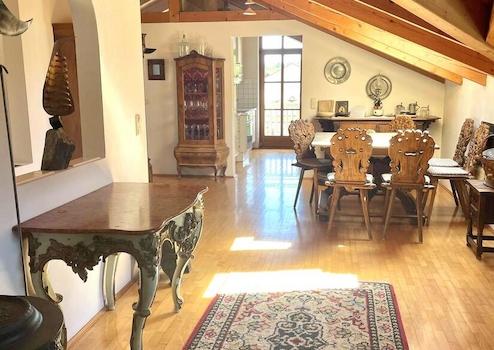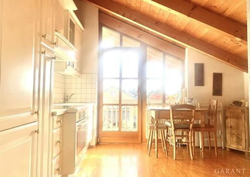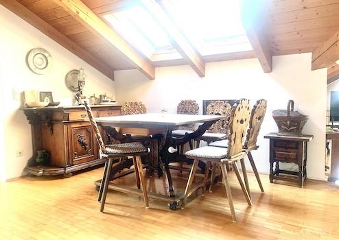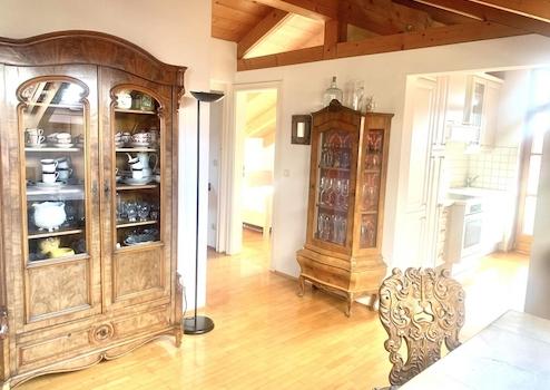 Die Wohnung ist ein echtes Schmuckstück, das mit seinem Sichtdachstuhl und hochwertigem Parkett überzeugt.