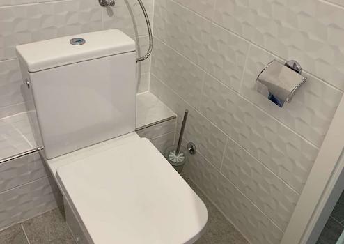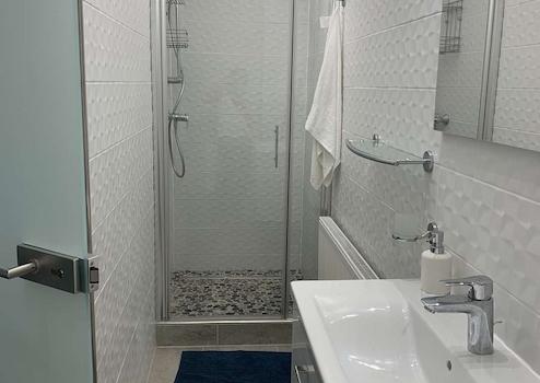 Neuwertiges Bad mit moderner Dusche; schöner Laminatboden.