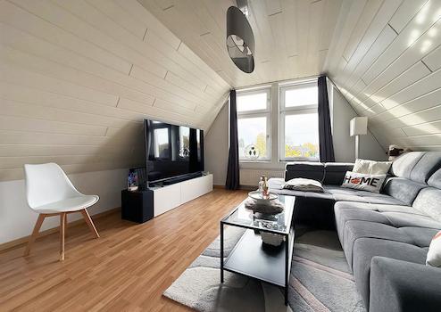 Wohnung 2 im Obergeschoss (ca. 87 m²): Zwei Zimmer, Küche, Diele, Bad, Dachterrasse