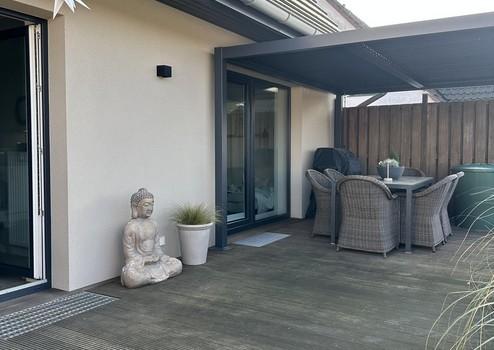 Große überdachte Terrasse / Pergola mit Lamellendach und noch eine zweite Sitzecke hinter der Garage.