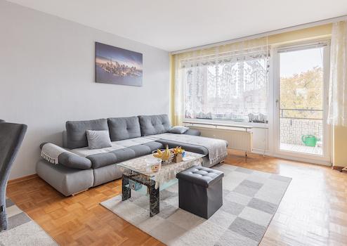 Vom Eingangs- und Flurbereich, wo sich eine praktische Abstellkammer befindet, sind alle Räume direkt begehbar. Lebensmittelpunkt stellt der großzügig geschnittene Wohnbereich mit großer Fensterfront dar, der den direkten Zugang auf die davorliegende West-Loggia gewährt. Hier befindet sich eine kleine Abstellkammer für Gartenmöbel o.ä.