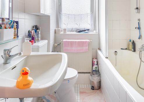 Abgerundet wird das Platzangebot durch ein hell gefliestes Vollbad mit Fenster. Während im Wohnzimmer ein Echtholzparkettfussboden verlegt wurde, sind Badezimmer und Küche pflegeleicht gefliest und der Rest der Wohnung mit einem hellen Laminatfussboden ausgestattet.