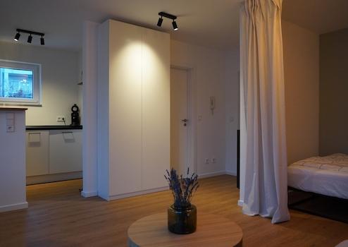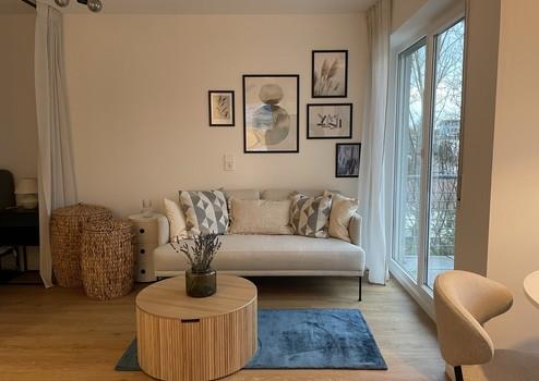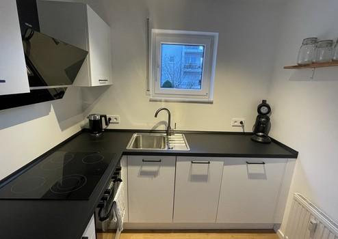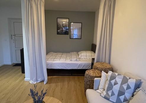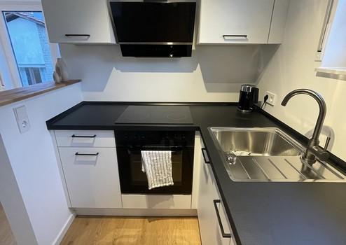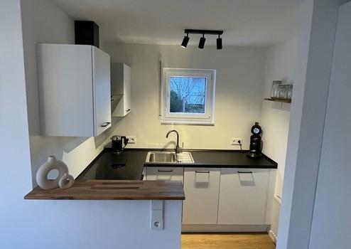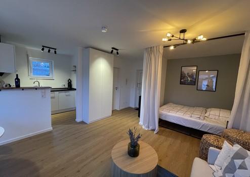 Die renovierte, modern geschnittene Wohnung befindet sich im 1. OG und hat 29qm Wohnfläche. Zur Ausstattung gehört eine neuwertige Einbauküche mit Herd, Backofen, Spülmaschine und Kühlgefrierkombi. Neben dem Tageslicht-Bad mit neuer Dusche, Toilette und Waschbecken, befindet sich im Flur eine Garderobe mit Schuhschrank. Der offen geschnittene Wohn- und Essbereich ist mit einem Sofa, einem Beistelltisch, einem Esstisch mit zwei Stühlen, einem Kleiderschrank, einem Bett (140x200cm), einer Nachtischlampe, einerm Fernseher (Smart TV) und Aufbewahrungskörbe mit viel Stauraum eingerichtet. Die Waschmaschine mit Trockner zur alleinigen Nutzung befinden sich im gemeinschaftlichen Waschkeller. Zudem gehört zur Wohnung ein KFZ-Stellplatz, und ein geräumiger Abstellkeller.