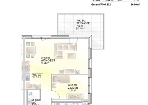 Das Angebot bezieht sich auf die Wohnung S 02 im Untergeschoß. Sie gelangen über eine geräumige Diele mit Garderobe in die Wohnung. Von der Diele gelangen Sie in den hellen geräumigen Wohn/Eßbereich mit offener Küche von ca. 37 m² mit Ausgang auf die schöne Terrasse. Von der Diele gelangen Sie ebenfalls in das Kinderzimmer/Büro von ca. 12 m² , das geräumige Bad mit Fenster von ca. 7 m² - ausgestattet mit Wanne und Dusche sowie das gut aufgeteilte Schlafzimmer von ca. 16 m². Garderobe, Gäste-WC und Abstellraum vervollständigen das Angebot. Die Wohnung hat eine Wohnfläche von ca. 97 m².