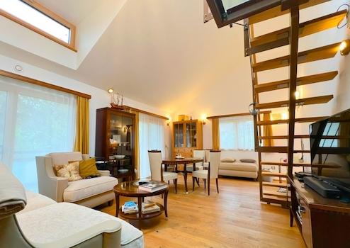 Die ausgewöhnliche Wohnung im 1.Obergeschoss mit 2 Zimmern mit stylischer Galerieebene und ca. 92m² Wfl. besitzt ebenfalls einen ca. 38m² großer Wohn-/Essbereich mit direktem Anschluss an einen Balkon, mit süd-/ westlicher Ausrichtung, dem Aufgang zur Galerie und einem angegliederten Küchenbereich, der mit einer modernen EBK ausgestattet ist. Des Weiteren verfügt die Wohnung über ein Schlafzimmer und ein Bad mit Dusche. Sowohl der Wohn-/Essbereich, als auch das Schlafzimmer sind an einer Klimaanlage angeschlossen.