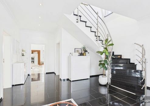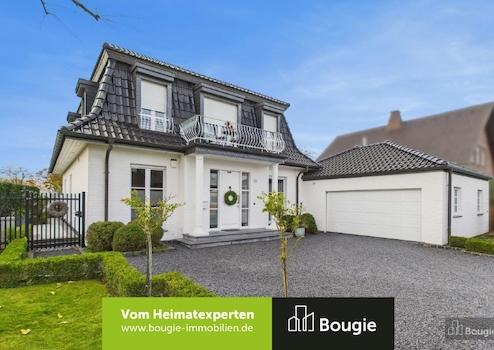 Willkommen in einem Zuhause, das Stil, Großzügigkeit und Leichtigkeit vereint. Dieses elegante Einfamilienhaus beeindruckt bereits beim ersten Blick: Das Mansarddach, die weißen Säulen und die klare Architektur verleihen dem Haus eine zeitlose, hochwertige Ausstrahlung. Die gepflegte Einfahrt und die große Doppelgarage runden den repräsentativen Empfang ab.