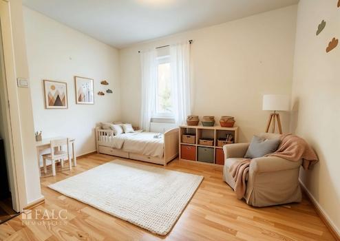 Im Obergeschoss erwartet Sie ein großes Schlafzimmer, ein weiteres Zimmer, das sich ideal als Kinderzimmer oder Büro nutzen lässt, sowie ein kleineres Zimmer, das aktuell als Ankleide dient. Das Tageslichtbad ist großzügig gestaltet und bietet sowohl eine Dusche als auch eine Badewanne – ideal für entspannte Wohlfühlmomente.
