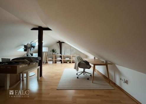 Ein weiteres Highlight ist das Dachgeschoss, das aktuell über eine steilere Holztreppe erreichbar ist. Hier bietet sich Ihnen ein großer, vielseitig nutzbarer Raum – ob als Hobbyzimmer, Homeoffice oder Kinderhöhle. Für den Zugang bestehen zwei attraktive Möglichkeiten: Entweder der Einbau einer Wendeltreppe oder die Umgestaltung des derzeitigen Ankleidezimmers zu einem Treppenraum mit direktem Zugang nach oben.
