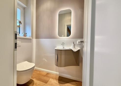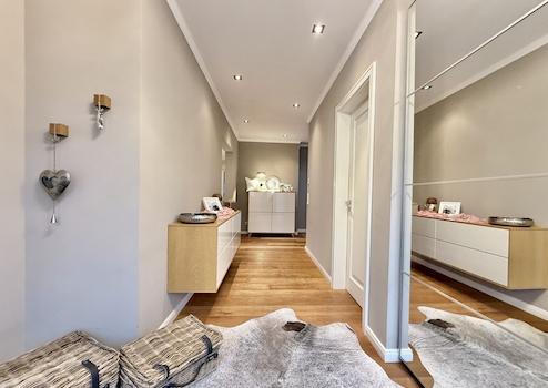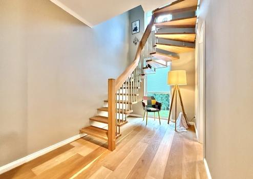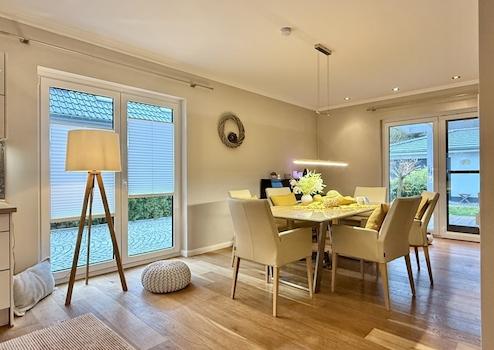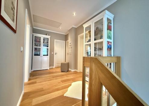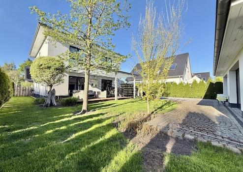 Das Obergeschoss umfasst drei Schlafzimmer sowie ein kleines Arbeitszimmer, das ideal für Homeoffice-Nutzer geeignet ist. Ein weiteres Highlight ist die hochwertige, überdachte Terrasse, die einen nahtlosen Übergang zwischen Wohnraum und Garten schafft und bei jedem Wetter genutzt werden kann. Der gepflegte Garten lädt mit einem automatischen Bewässerungssystem zum Entspannen ein. Das ca. 711 m² große Grundstück besticht durch gepflasterte Wege und eine ebenso gepflasterte Einfahrt.