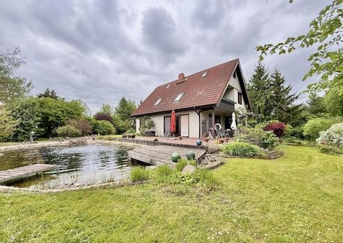 Die Ausstattung umfasst unter anderem eine moderne Ölheizung mit zentraler Warmwasserversorgung und einen 6.000-Liter-Öltank. Auf dem weitläufigen Grundstück mit ca. 2.192 m² Fläche finden sich ein liebevoll angelegter Garten, ein Schwimmteich sowie ausreichend Platz für Erholung und Freizeitgestaltung. Eine Doppel-Fertigteilgarage sowie zusätzliche Stellflächen ergänzen das Angebot.