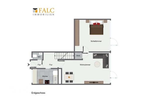 Im Erdgeschoss befindet sich zudem ein Schlafzimmer, das sich ideal als Gäste- oder Arbeitszimmer nutzen lässt. Der Zugang zum Obergeschoss erfolgt über eine Treppe im Flur.