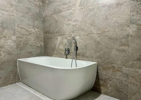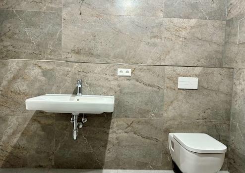 Durch die beiden Badezimmer, ausgestattet mit Wandfliesen in Marmor-Optik und hochwertigen Armaturen, genießen Sie die Annehmlichkeiten einer ebenerdigen Dusche und einer großzügigen Badewanne.