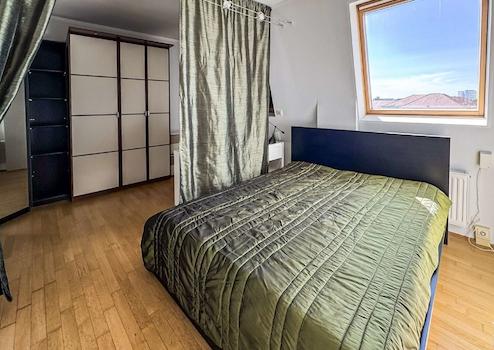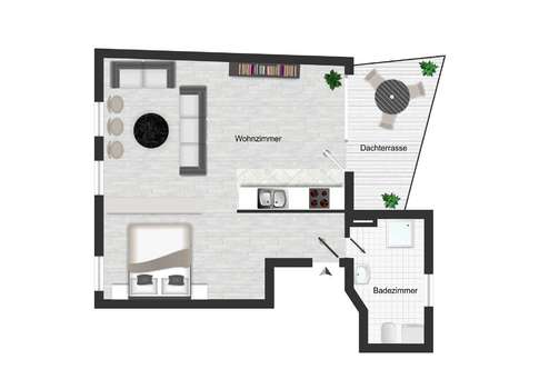 Die obere Etage ist über das Treppenhaus erreichbar und bietet einen separaten Zugang. Nach einem kleinen Eingangsbereich führt Sie ein Flur in den wunderschönen Wohnraum, der mit einer Klimaanlage ausgestattet ist und über eine weitere Einbauküche verfügt. Von hier aus gelangen Sie direkt auf die großzügige Dachterrasse – ein echtes Highlight der Wohnung, von dem Sie erneut einen unvergleichlichen Blick über die Dächer Leipzigs genießen. Auf dieser Ebene befinden sich außerdem ein optisch durch eine Schrankwand abgetrennter Schlafbereich sowie ein Tageslichtbad mit Dusche. Das Schlafzimmer kann durch den Einbau einer Trockenbauwand noch stärker als eigener Raum abgetrennt werden.