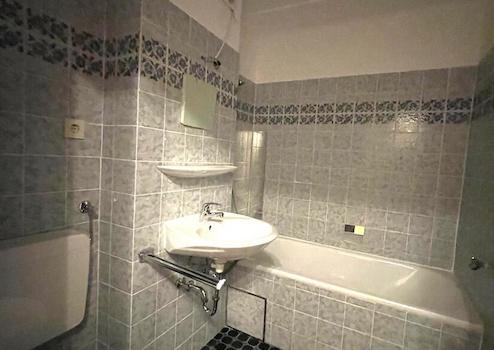 - Badezimmer mit Waschbecken, Badewanne und WC