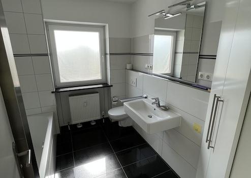 Die Wohnung bietet eine hochwertige Ausstattung, welche durch den dunklen Laminatboden in den Wohnräumen und die schwarzen Fliesen in der Küche, dem Bad und dem Gäste-WC unterstrichen wird. Zahlreiche Fenster schaffen ein helles, angenehmes Ambiente. Das Tageslicht-Bad verfügt nicht nur über ein großes Fenster und Badewanne sondern auch über einen praktischen Einbauschrank. Bad und Gäste-WC mit moderner, weißer Sanitärausstattung. Die Einbauküche mit weißen Hochglanz-Schränken punktet außerdem mit hochwertigen Miele- und Siemens-Geräten.