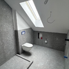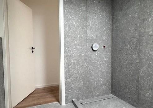 - Designer-Bad mit bodentiefer Grohe-Regenwalddusche, großformatigen Fliesen (120 × 60 cm), Unterputzarmaturen, Design-WC und - Handtuchheizkörper