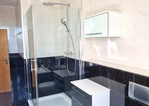 + Naturstein im Bad, Modernes Wannenbad und Glasdusche