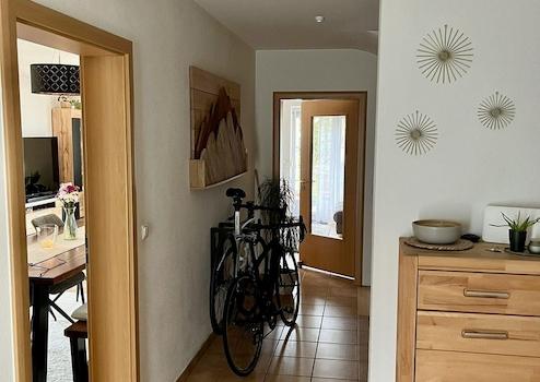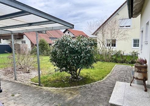 Im Außenbereich runden ein überdachter Fahrradabstellplatz hinter der Garage sowie eine praktische Tür in der Garagenrückseite das Angebot ab.