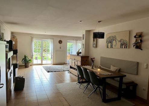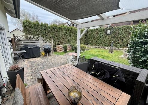 Im Erdgeschoss erwartet Sie ein großzügiger, offener Wohn- und Essbereich mit integrierter Einbauküche sowie praktischer Speisekammer. Von hier aus genießen Sie den direkten Zugang zum Garten, der durch eine blickdichte Hecke rundum geschützt ist und somit ein hohes Maß an Privatsphäre bietet. Der Eingang ist zudem komfortabel über nur eine Stufe erreichbar.