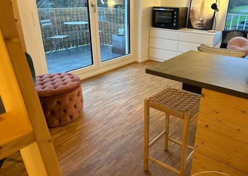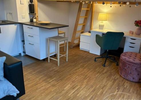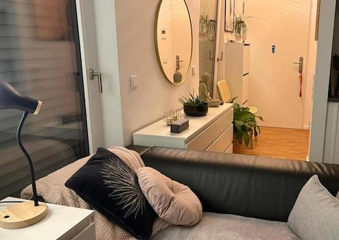 Modern möbliertes Neubau-Apartment mit Balkon in Frankfurt-BockenheimWohnen: Heller Wohn-/Schlafbereich mit bodentiefen Fenstern und Blick ins Grüne/SkylineKüche: Moderne Einbauküche mit Kochfeld, kl. Backofen, Kühlschrank mit Gefrierfach, Spüle und SitzthekeEssbereich: Sitztheke mit Barhockern als EssbereichSchlafen: Hochbett 140x200 cm, geeignet für 1-2 PersonenBad: Modernes Duschbad mit Waschmaschine und TrocknerTechnische Ausstattung: Internet, Fußbodenheizung, Waschmaschine, TrocknerStauraum: Ausreichend Stauraum durch Schränke und Kommoden in der WohnungBalkon: Großer Balkon mit Blick auf Schrebergärten und SkylineGarten: Nein Parken: Gute Parkmöglichkeiten auf der StraßeHausinfo: Neubau 2023Aufzug verfügbarEs kann Yoga Equipment mitgenutzt werden. Sonstiges zum Mietverhältnis: In der Miete ist ebenfalls eine zweiwöchige Reinigung enthalten. Befristet vom 15.12.2025 bis 31.12.2026.Verlängerung auf Nachfrage möglichAnbindung und Stadtteil-Info: Sehr gute ÖPNV-Anbindung (Bus M32, M34, M72, U6, U7), Einkaufsmöglichkeiten und Freizeitangebote (Brentanobad, Brentanostadion, Hausener Frei-/Hallenbad) fußläufig erreichbar.