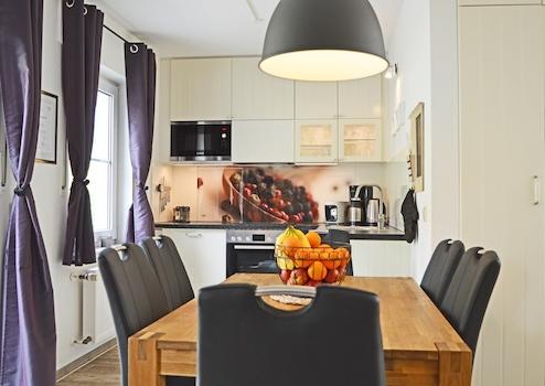 Geschirrspüler, Backofen, Ceran-Kochfeld, Mikrowelle, Gefrierfach, Kaffeemaschine, Mixer, Toaster, Waffeleisen, Eierkocher, Geschirrtücher, Gewürze u.v.m. – alles ist vorhanden, damit Sie entspannt kochen können wie zuhause.