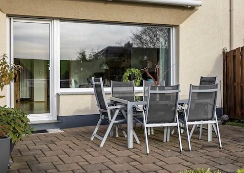Im Erdgeschoss begrüßt Sie ein großzügiger Eingangsbereich, von dem aus Sie das Gäste-WC, die Küche sowie den lichtdurchfluteten Wohn- und Essbereich erreichen. Die Küche ist mit einer modernen Einbauküche ausgestattet und bietet ausreichend Platz für einen Esstisch. Der offen gestaltete Wohn-/Essbereich besticht durch eine große Fensterfläche mit direktem Zugang zur Terrasse, die mit einer elektrischen Markise ausgestattet ist.