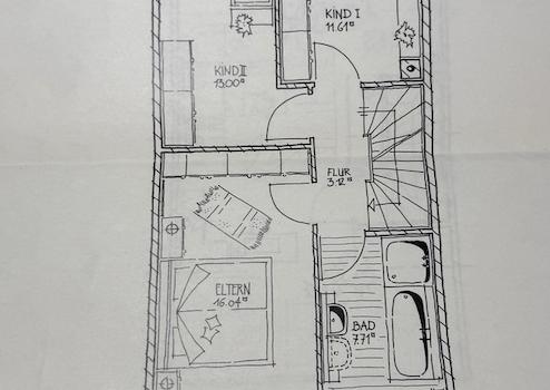 - Obergeschoss: Zwei Kinderzimmer (13 m² und 11,61 m²), ein Elternschlafzimmer (16,04 m²) mit angrenzendem Balkon (3,25 m²) und Tageslicht Bad (7,71 m²) mit Doppelwaschbecken, Dusche und Wanne.