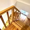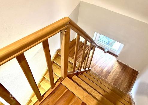 Schön gestaltet ist das Treppenhaus aus hellem Holz; dazu passend die Zimmertüren.