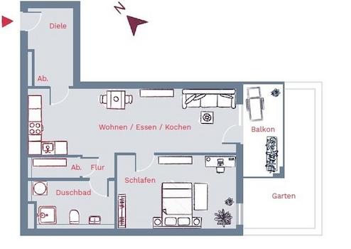 Der offene Wohn- und Essbereich mit bodentiefen Fenstern sorgt für viel Licht und ein angenehmes Wohngefühl. Von hier aus gelangen Sie auf einen Südbalkon mit einem kleinen Garten, der zum Entspannen einlädt.
