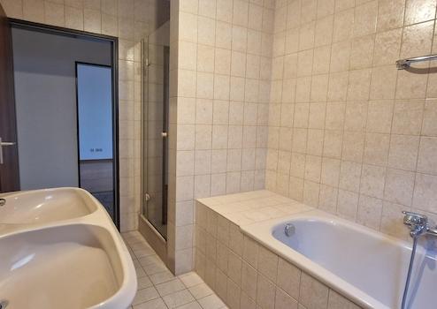 Steingutfliesen in Deckenhöhe, Badewanne, Dusche,