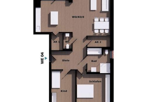 - Bad: Dusche (bodengleich, Echtglaswand), Wanne, WC, Waschtisch, Handtuchheizkörper