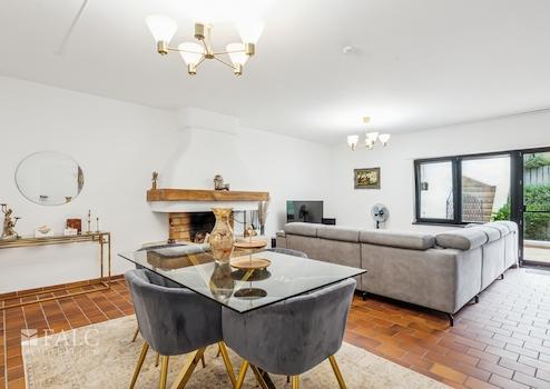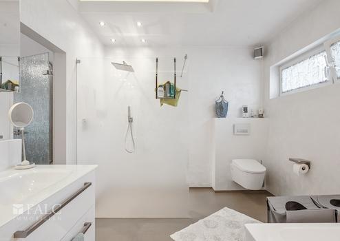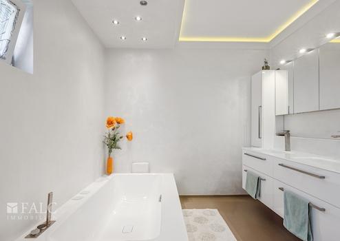 Das Herzstück des Hauses ist der offene Wohnbereich, der nahtlos in einen lichtdurchfluteten Wintergarten mit Kamin übergeht. Hier genießen Sie entspannte Abende mit Familie und Freunden – behaglich warm im Winter und hell & einladend im Sommer. Das Badezimmer im Erdgeschoss wurde aufwendig kernsaniert und ist heute ein echtes Highlight: mit stilvollem Doppelwaschtisch aus Glas, moderner Dusche, Badewanne, Wand- und Fußbodenheizung sowie App-gesteuerter Temperaturregelung bietet es höchsten Komfort. Durch den direkten Zugang vom Schlafzimmer wird es zum ganz persönlichen Wellnessbereich.