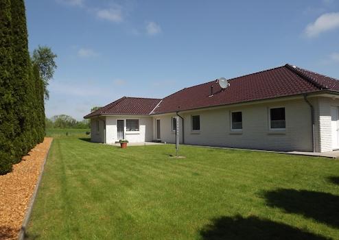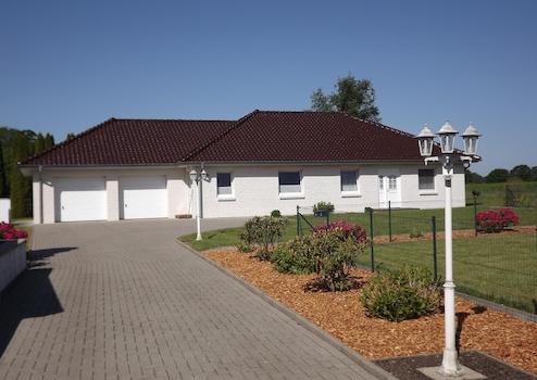 Der Walmdachbungalow mit Doppelgarage wurde im Jahr 2004 in Massivbauweise(Stein-auf-Stein) erbaut, und von den heutigen Eigentümern erst bezogen. Die Fassade besteht aus bossiertem weißen Kalksandstein Mauerwerk und das Dach ist mit braun glasierten Tondachziegeln eingedeckt.