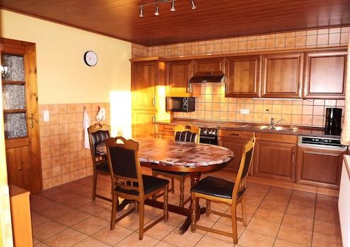 Die Küche mit der kirschholzfarbenen Marken- Einbauküche bietet ausreichend Platz für einen Esstisch, an dem 6 Personen Platz nehmen , und in gemütlicher Familienrunde verweilen können.