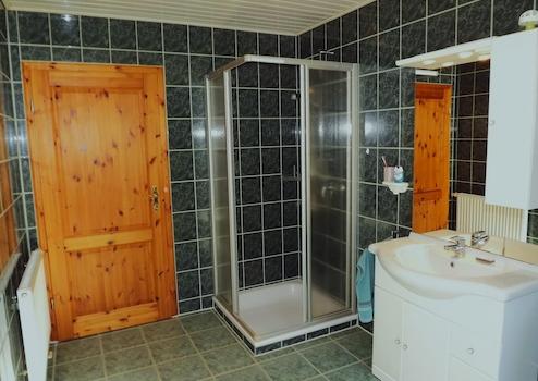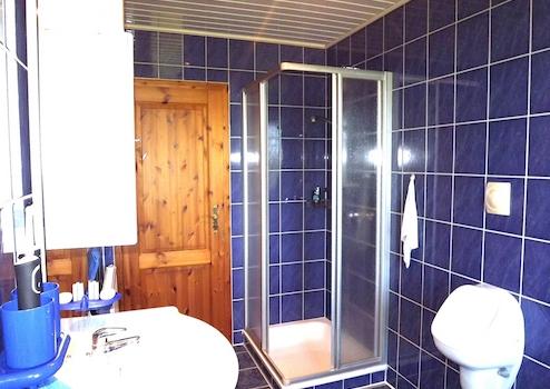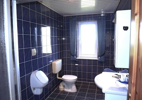 Duschbad mit Dusche, Waschtisch-Badblock, Urinal und WC.
