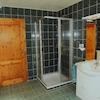 Vollbad mit Badewanne, Dusche, Waschtisch-Badblock, und WC.