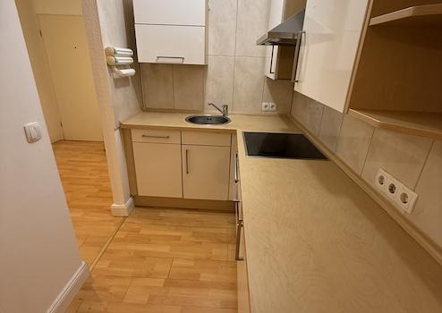 Die zeitgemäße Einbauküche verfügt über einem Einbauherd mit Cerankochfeld, einen Kühlschrank sowie Ober- und Unterschränke mit hellen Fronten. Zum Wohnbereich ist die Küche offen gestaltet.