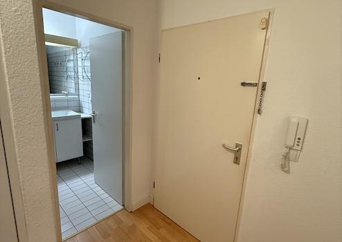 Von dem Flur erreichen Sie das Wohnzimmer und das Badezimmer.