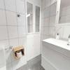 Das Badezimmer überzeugt durch seine zeitgemäße Ausstattung und gepflegte Erscheinung. Besonders hervorzuheben ist die großzügige, bodengleiche Dusche mit eleganter Glasabtrennung, deren warme Holzoptik für eine gemütliche und hochwertige Atmosphäre sorgt. Helle Wandfliesen und ein dunkler Bodenbelag erzeugen einen stilvollen Kontrast und verleihen dem Raum ein freundliches, einladendes Ambiente. Ergänzt wird die Ausstattung durch ein separates Gäste-WC, das zusätzlichen Komfort im Alltag bietet.